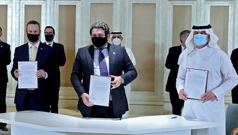 | Cérémonie de signature d'un accord lors du premier Sommet commercial des accords d'Abraham à Abu Dhabi le 19 octobre, en présence du secrétaire américain au Trésor, Steven Mnuchin. |