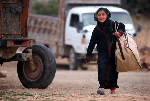 | Une enfant syrienne ayant fui les combats à Kharoufiya, près de Minbej, le 4 mars 2017. |