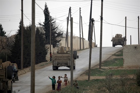 | Des blindés des forces militaires de Minbej, alliées des Forces démocratiques syriennes, patrouillent à Minbej, le 3 mars 2017. |