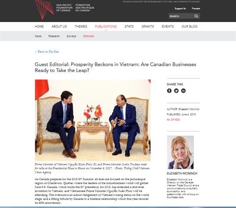 Selon l’article, alors que le Canada assume la présidence du G7 pour 2018 et accueille le Sommet du G7 du 8 au 9 juin, le pays a invité le Vietnam à participer à cet événement. C’est une reconnaissance du statut croissant du Vietnam sur la scène mondiale et une preuve de la volonté du Canada de promouvoir les relations bilatérales cette année, où les deux pays célèbrent les  45 ans de l’établissement de leurs relations diplomatiques.