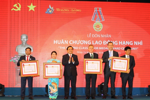 | Cérémonie de remise d’Ordre du Travail et des satisfecit du Premier ministre à plusieurs individus et collectifs ayant été exemplaires dans l'exploitation des premiers lots de brut de la plate-forme H5, le 30 octobre à Hô Chi Minh-Ville. |