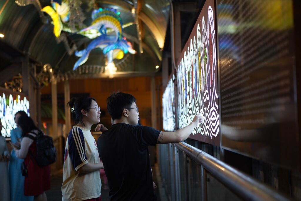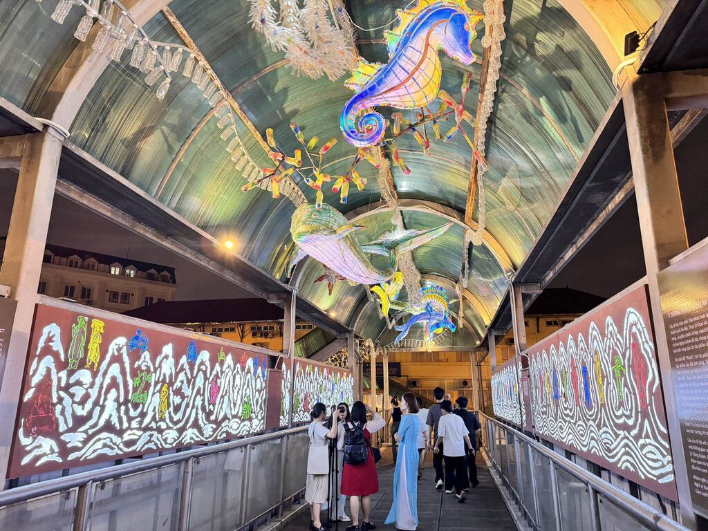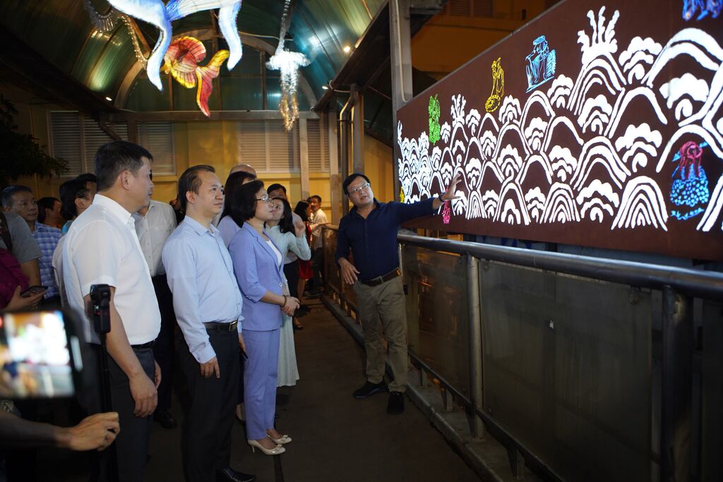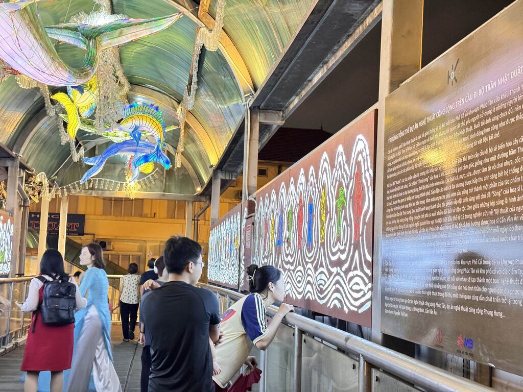 | Placées sous le thème de l’"Eau", les installations artistiques du pont piétonnier Trân Nhât Duât, dont certaines ont été créées à partir de matériaux recyclés, transforment le pont en "aquarium coloré et animé" de lumières et de dessins 3D. |