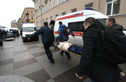 | Des hommes portent un blessé à l'extérieur de la station de métro de l'Institut technologique, le 3 avril à Saint-Pétersbourg après une explosion survenue dans un wagon qui a fait 10 morts. |