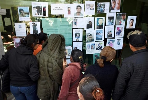 | Des personnes cherchent les noms de leurs proches sur la liste des disparus dans l'explosion d'un oléoduc perforé par des voleurs de carburants, à Tlahuelilpan, dans le centre du Mexique, le 20 janvier. |