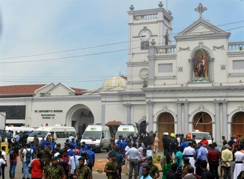 | Des ambulances stationnent devant l'église Saint-Anthony de Colombo après une explosion meurtrière, le 21 avril. |