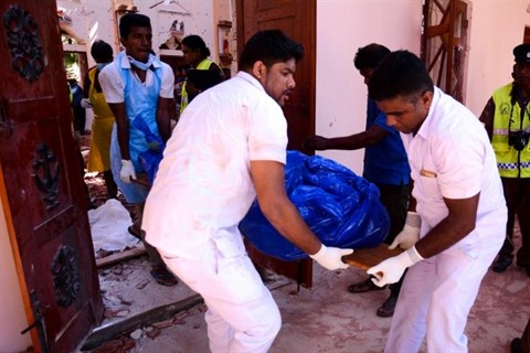 | Des corps de victimes sont transportés hors de l'église Saint-Sébastien à Negombo (Sri Lanka), frappée par un attentat le 21 avril. |