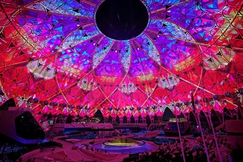 Des projections et effets de lumières ont illuminé le Al-Wasl Plaza, une enceinte futuriste en forme de dôme, symbole de l'architecture islamique. Des concerts divers ont suivi, dont ceux de la célèbre diva émiratie Ahlam ou de la chanteuse britannique Ellie Goulding.