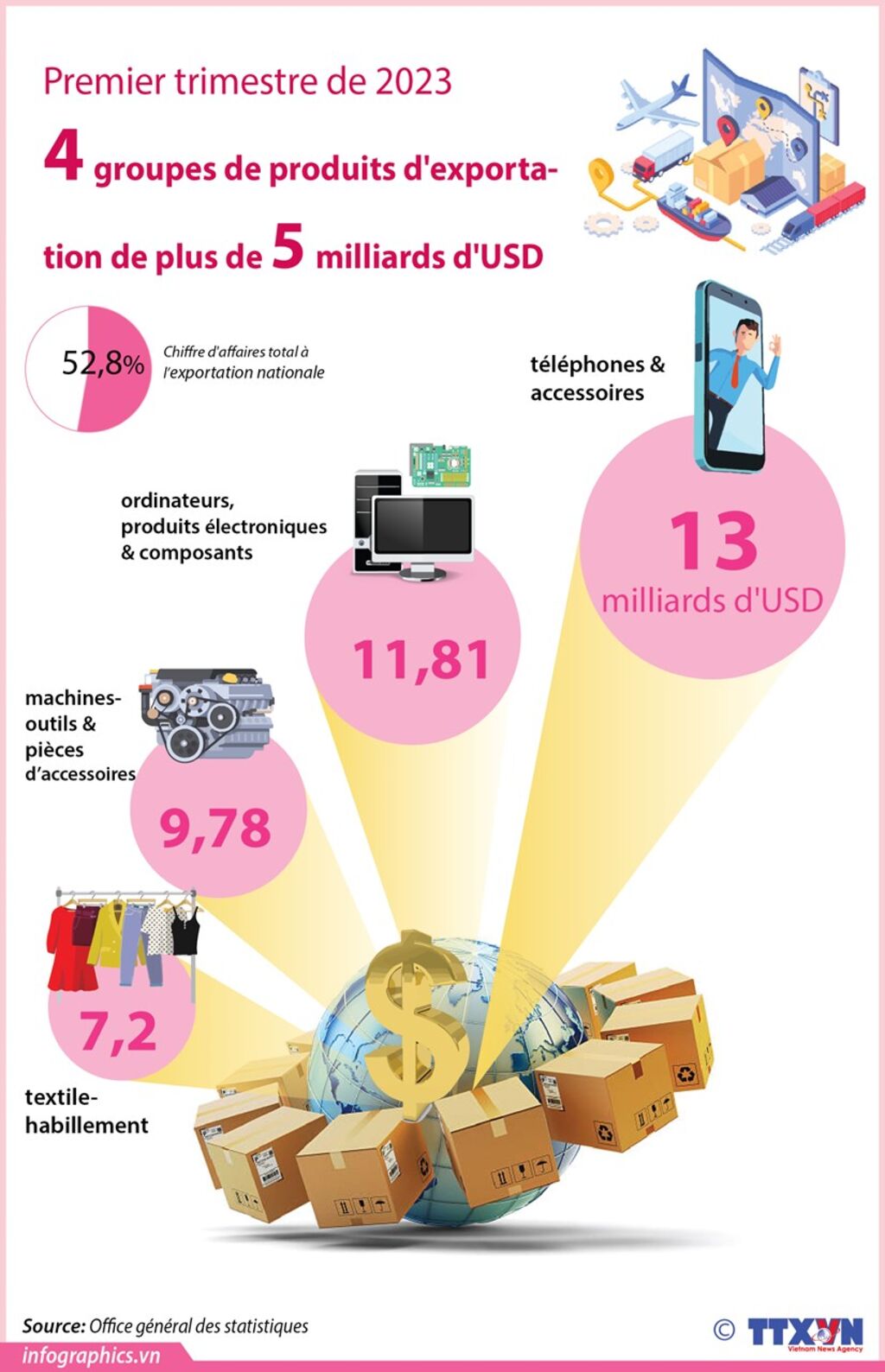 Au premier trimestre de 2023, ce sont quatre groupes de produits d'exportation qui ont rapporté plus de 5 milliards d'USD.
