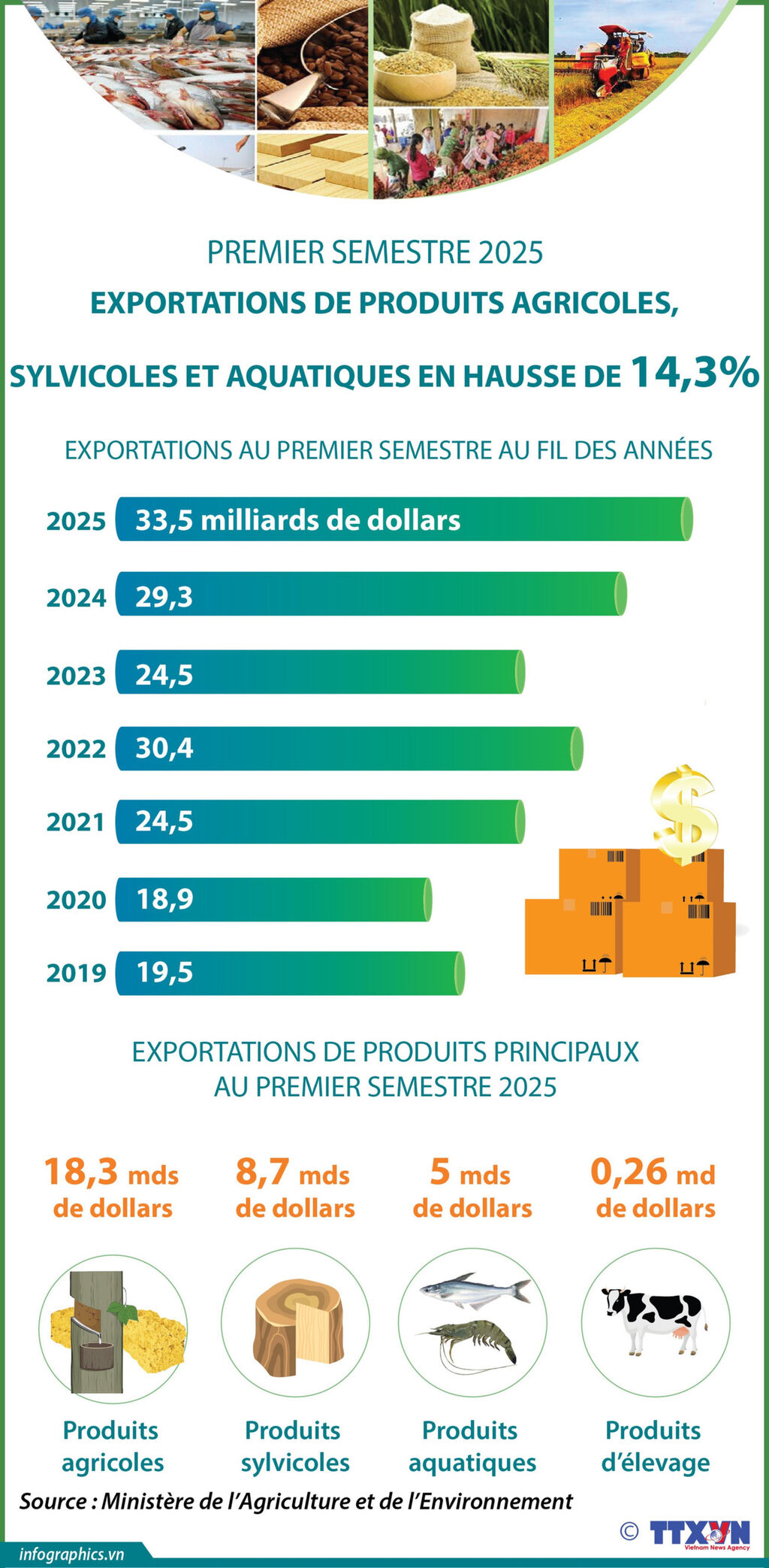 Selon le ministère de l'Agriculture et de l'Environnement, au cours des six premiers mois de 2025, les exportations de produits agricoles, sylvicoles et aquatiques sont estimées à 33,5 milliards de dollars, soit une augmentation de 14,3% sur un an.