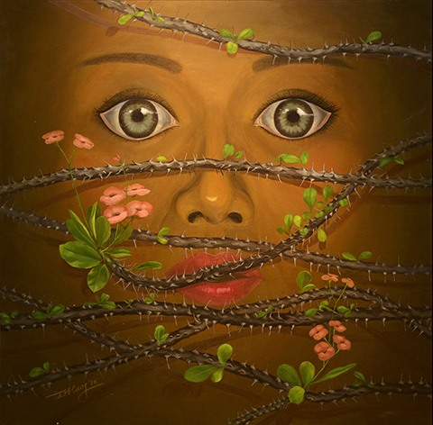 | La peinture à huile +Nhìn+ (Regarder) de l'artiste Tào Huong, lors de l'exposition +Conversation contemporaine+. |