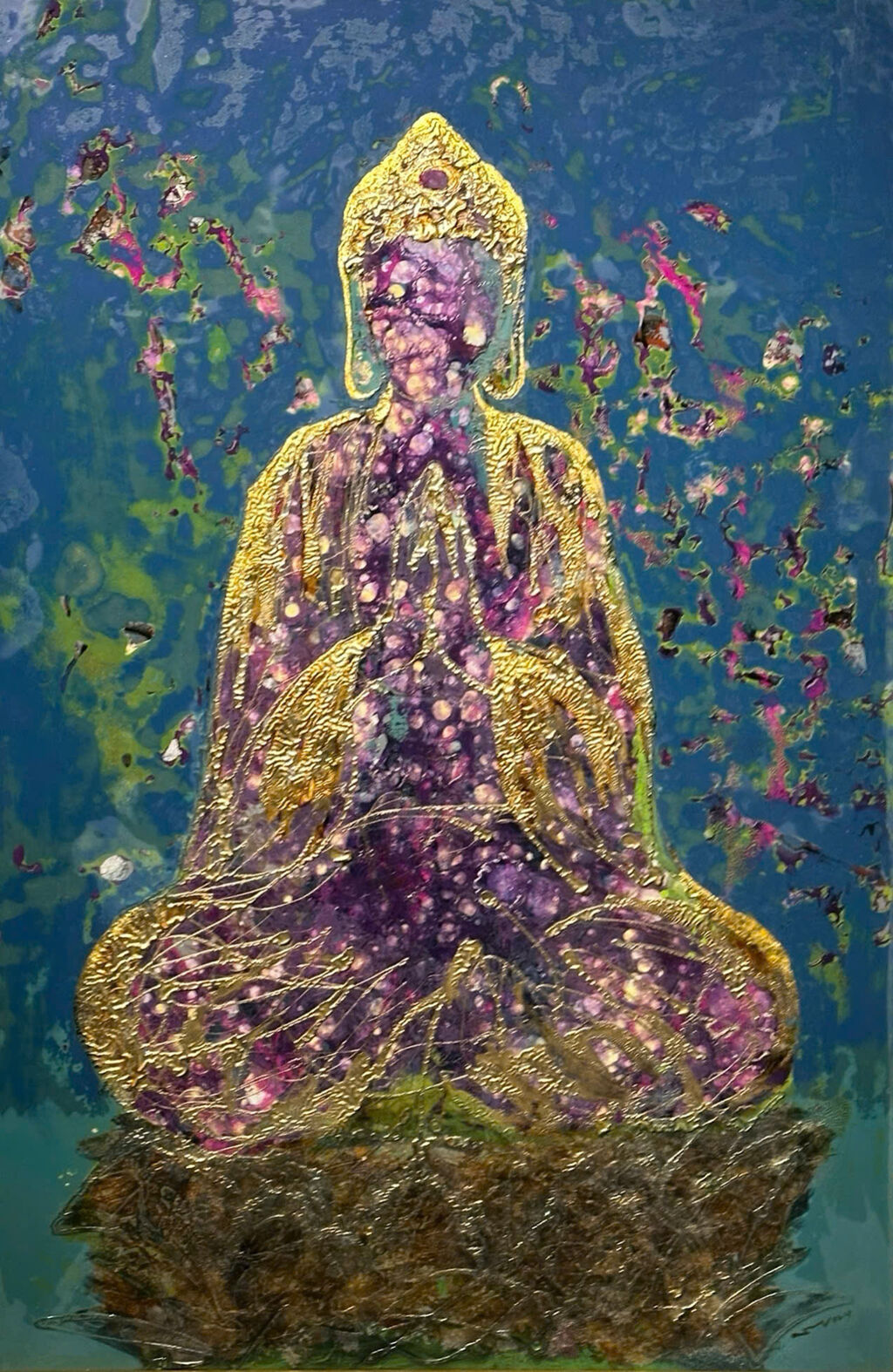 Par un style abstrait, l’artiste conduit le spectateur dans un espace méditatif, silencieux mais empreint d’onirisme et de mystère, tout en restant simple et dépouillé, à travers des représentations de la nature (le lotus) ou de figures religieuses (le Bouddha).
