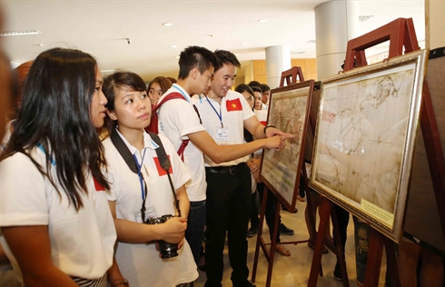 | Des jeunes Viêt kiêu à l'exposition «Hoàng Sa-Truong Sa, parties territoriales inséparables du Vietnam» à Dà Nang (Centre). |