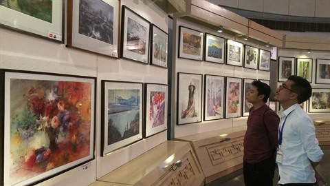 | Les visiteurs lors de la 2e édition de l’exposition internationale d'aquarelle, le 23 octobre au Musée de Hanoi. |