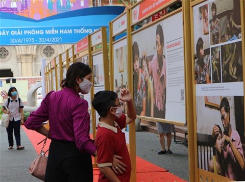 | Des visiteurs à l'exposition "Procès contre l’agence orange - un plaignant - des millions de victimes", le 8 mai. |