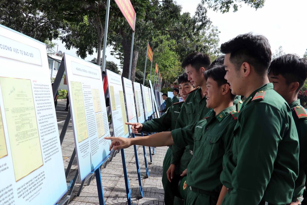 | Des soldats visitent l'exposition sur les archipels de Hoàng Sa et Truong Sa à Bà Ria-Vung Tàu. |