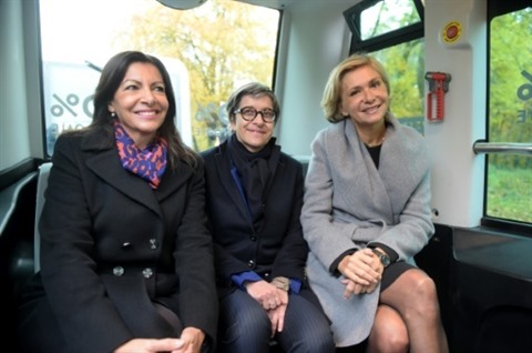 | La maire de Paris Anne Hidalgo (gauche), la président de la région Ile de France Valérie Pécresse (droite) et la PDG de la RATP Catherine Guillouard (centre) à Vincennes le 17 novembre 2017. |