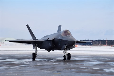 | Un nouvel avion de chasse F-35A à son arrivée sur la base aérienne japonaise de Misawa, le 26 janvier 2018. |