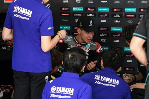 | Le pilote Yamaha, Fabio Quartararo, échange avec ses mécaniciens, lors des essais de pré-saison sur le circuit de Sepang, en Malaisie, le 7 février. |