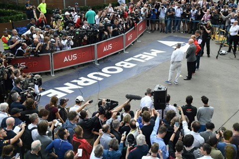 | Les responsables de la F1 et du GP d'Australie s'expriment devant la presse au sujet de l'annulation de la course inaugurale de la saison à Melbourne, le 13 mars. |