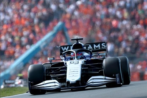 | Le pilote britannique George Russell au volant de sa Williams sur le circuit de Zandvoort durant les essais du Grand Prix des Pays-Bas de Formule 1 le 3 septembre. |