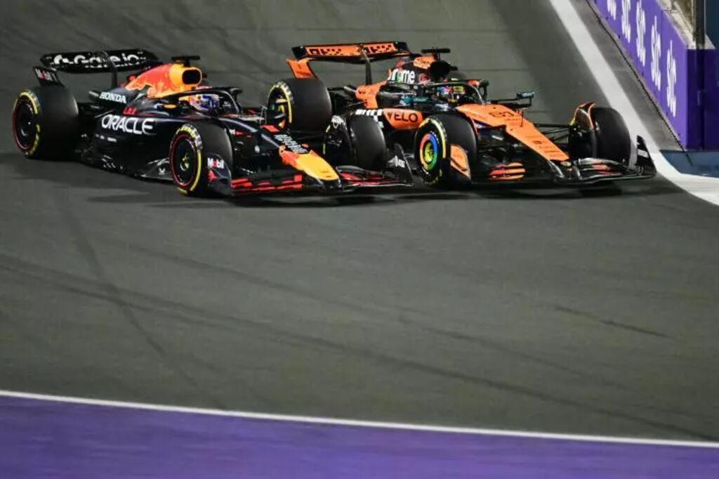 | L'Australien Oscar Piastri (McLaren, à droite) double le Néerlandais Max Verstappen (Red Bull) lors du Grand Prix d'Arabie saoudite sur le circuit de Jeddah le 20 avril. |