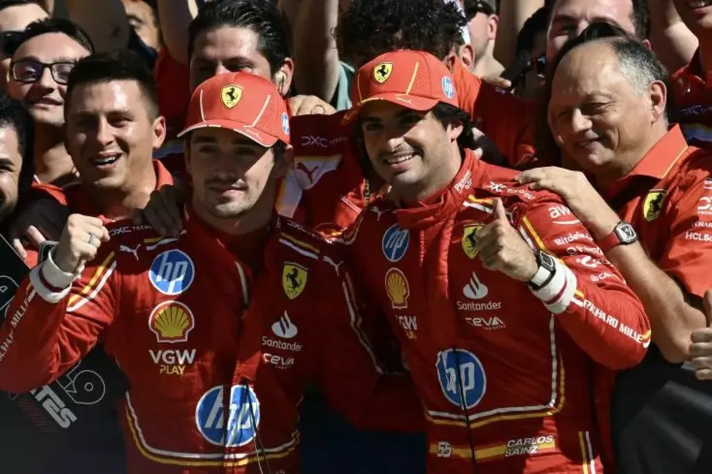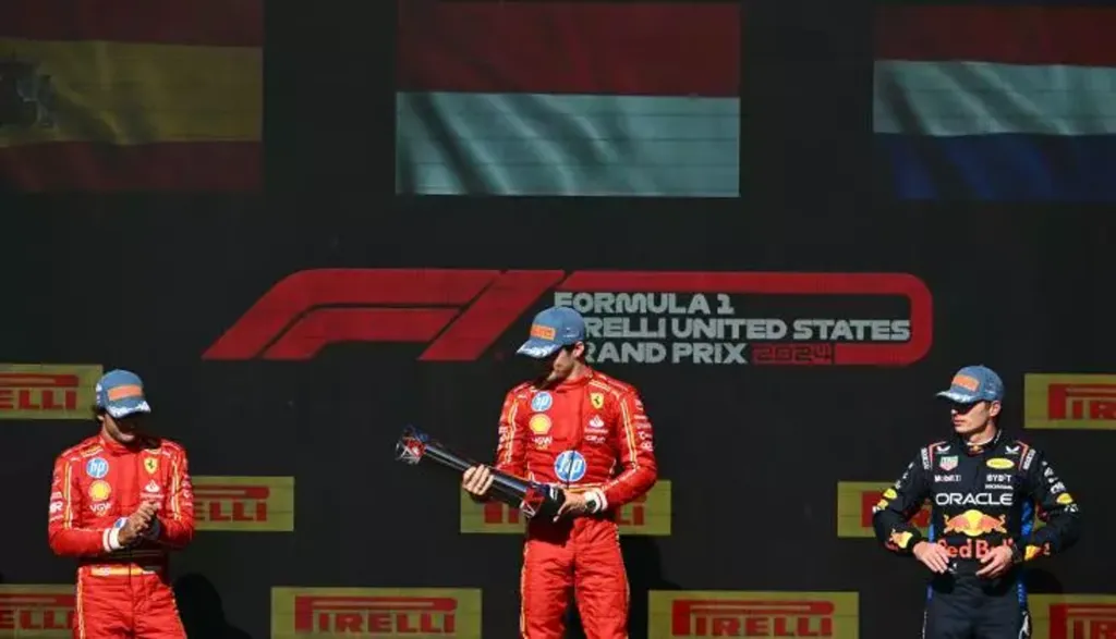 | (De gauche à droite) Charles Leclerc, pilote monégasque de Ferrari, Carlos Sainz Jr., pilote espagnol de Ferrari, et Frédéric Vasseur, directeur de l'équipe française de Ferrari, célèbrent le doublé de Ferrari au GP des États-Unis. |