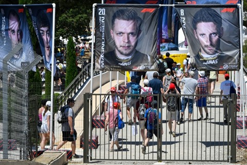 | Des effigies des pilotes de Haas, Kevin Magnussen et Romain Grosjean, sont dévoilées sur le circuit Paull Ricard, le 21 juin, en vue du GP de France au Castellet. |