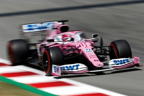 | Le Mexicain Sergio Pérez (Racing Point) lors des essais du GP d'Espagne, le 15 août à Montmélo, près de Barcelone. |