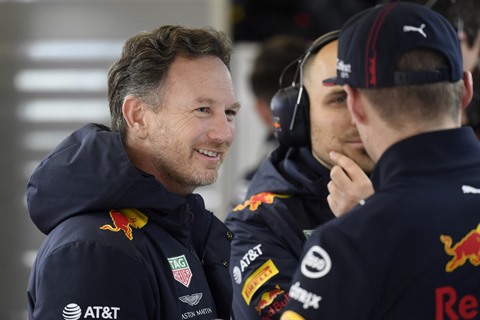 | Le directeur de l'écurie de F1 Red Bull, Christian Horner (gauche), sur le circuit de Catalogne, à Montmelo, le 27 février 2020. |