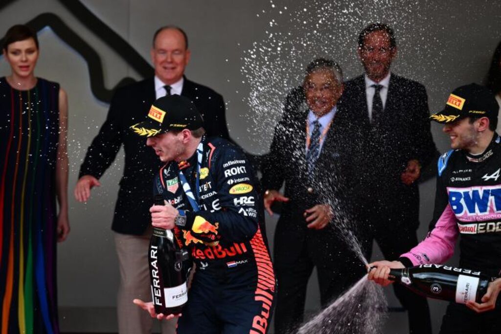 | Max Verstappen, vainqueur, et Esteban Ocon, 3e, sur le podium du Grand Prix de Monaco de F1, le 28 mai. |
