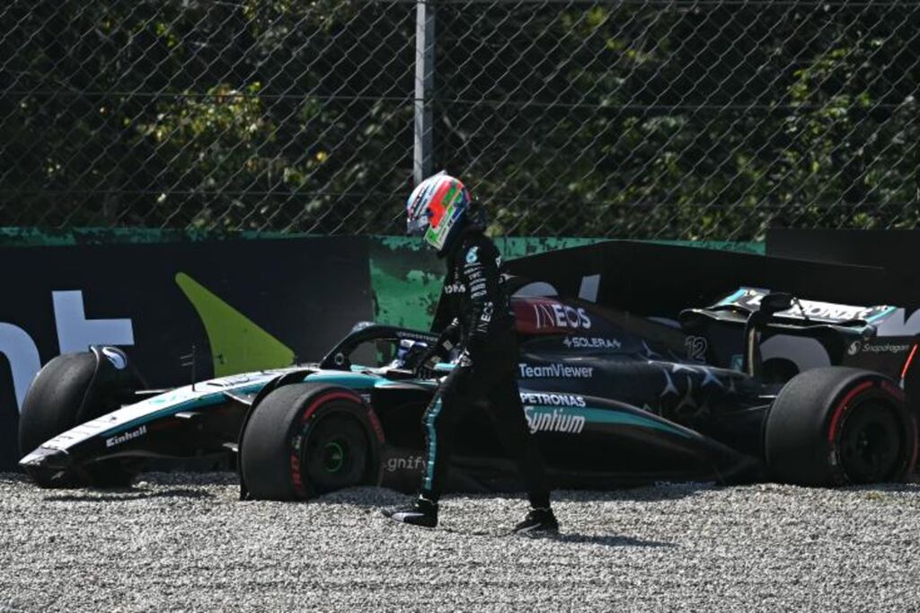 | Le pilote italien de Mercedes, Andrea Kimi Antonelli, quitte sa voiture après un crash lors de la première séance d'essais libres du GP d'Italie de F1, à Monza, le 30 août. |