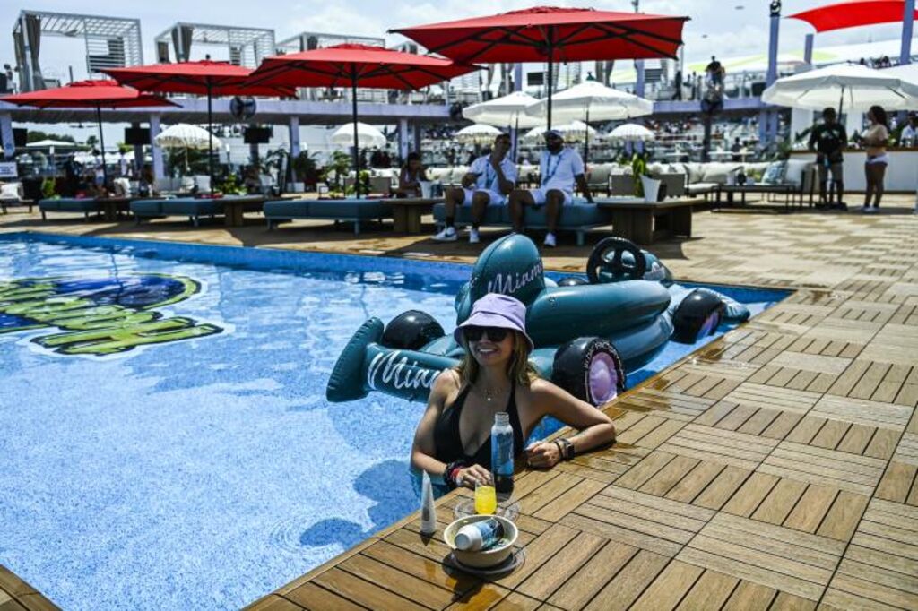 | Une jeune femme regarde les essais libres du GP de F1 de Miami depuis une piscine, le 5 mai. |