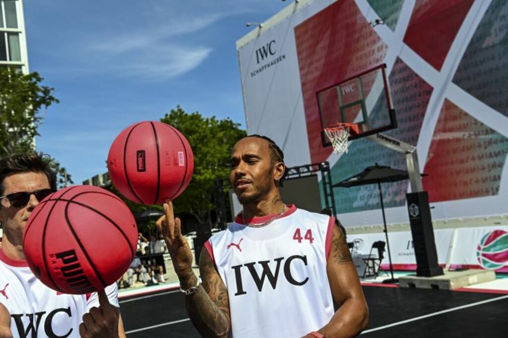 | Le pilote de F1, Lewis Hamilton, joue au basket, quelques jours avant le GP de Miami, le 3 mai. |