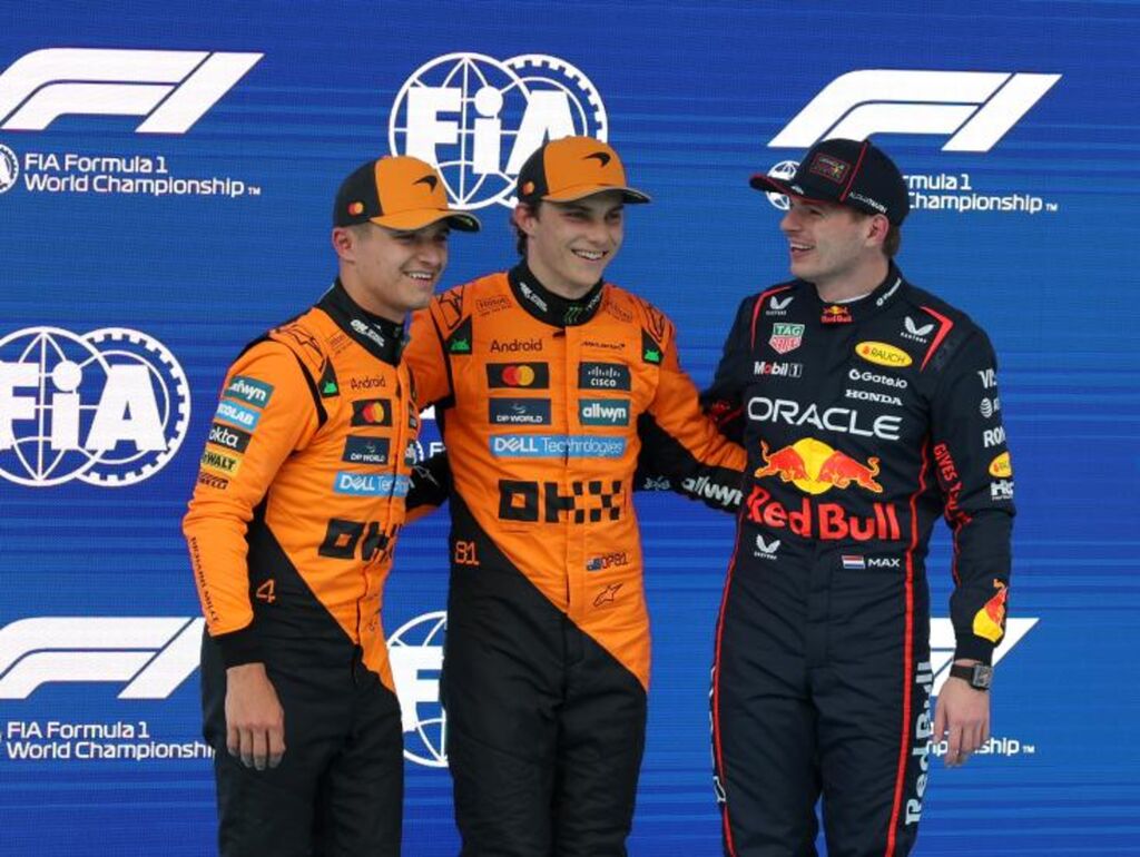 | Le pilote australien de McLaren Oscar Piastri (centre), entouré de son coéquipier britannique Lando Norris et du Néerlandais Max Verstappen (Red Bull) après les qualification du Grand Prix d'Espagne de Formule 1 sur le circuit de Catalunya à Montmelo le 31 mai. |