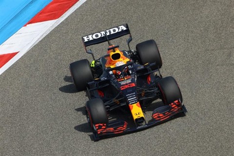 | Le pilote Red Bull, Max Verstappen, lors de la seconde séance d'essais libres du GP de Bahreïn sur le circuit de Sakhir, le 26 mars. |