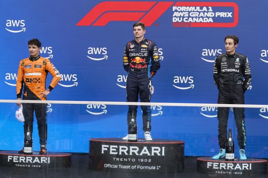 | Le pilote britannique de McLaren Lando Norris, le pilote néerlandais de Red Bull Max Verstappen, et le pilote britannique Mercedes George Russell (de gauche à droite) sur le podium le 9 juin. |