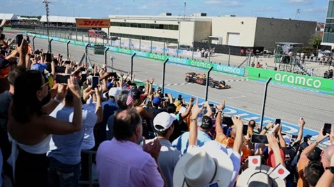 | Des milliers de fans massés dans les tribunes du circuit des Amériques, ici au passage de la Red Bull de Max Verstappen, le 24 octobre. |