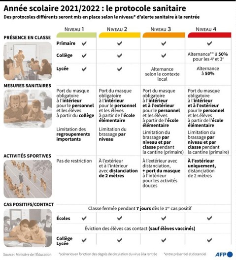 Le protocole sanitaire pour 2021-2022 a été publié mercredi matin 28 juillet sur le site de l'Éducation nationale et comprend "quatre scénarios en fonction de quatre degrés de circulation du virus", a précisé M. Blanquer.