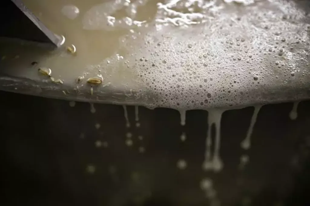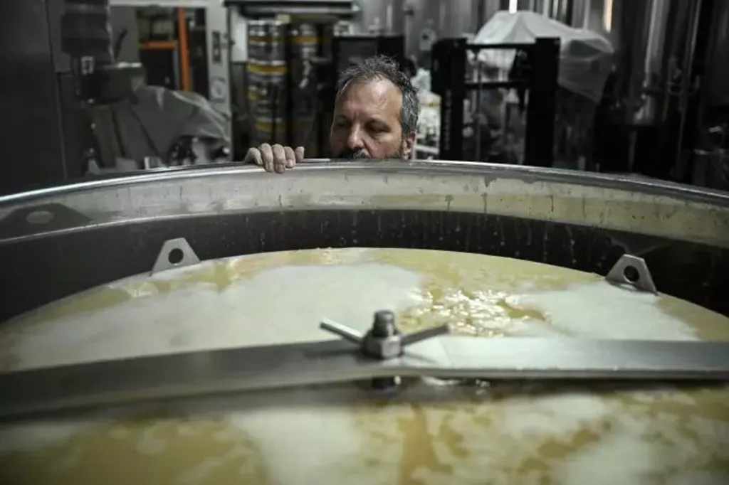 | De l'écume se forme à la surface d'une cuve dans la Brasserie Croix de Chavaux, le 20 juin à Montreuil, en Seine-Saint-Denis. |