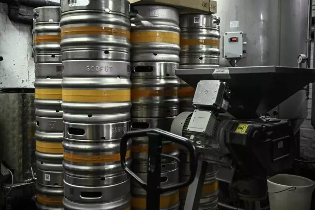 | Des fûts de bière stockés dans les locaux de la Brasserie Croix de Chavaux à Montreuil, en Seine-Saint-Denis, le 20 juin. |