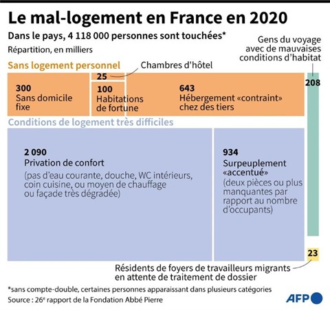 En 2020, la Fondation Abbé Pierre recensait dans le pays 4,1 millions de mal-logés, dont 300.000 sans domicile.