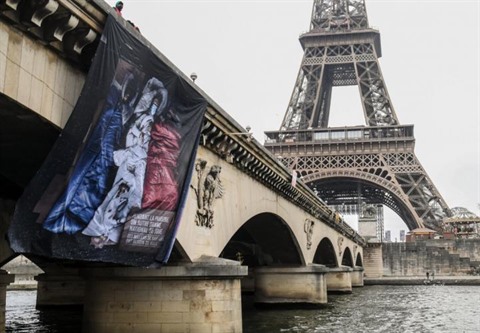 | Une banderole représentant le drapeau français et portant l'inscription "durant l'épidémie, une autre tragédie se produit. Des milliers de SDF ont besoin de nous", accrochée sur le pont Iena à Paris le 16 décembre 2020. |