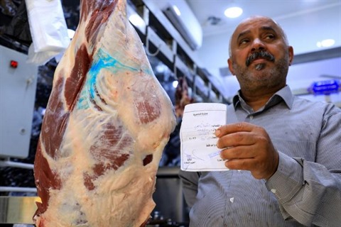 | Un boucher de la province de Dhi Qar montre un certificat prouvant que la viande n'est pas contaminée par la FHCC, le 25 mai |