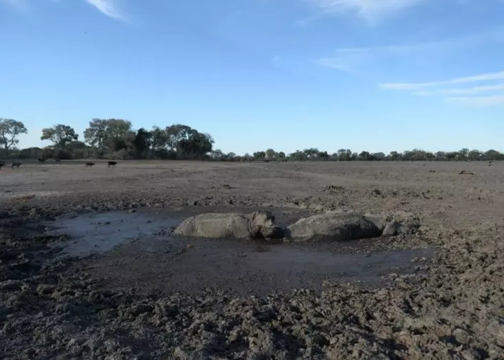 | Un hippopotame se tient à côté d'un congénère mort dans l'un des canaux asséchés du delta de l'Okavango, près du village de Nxaraga, le 28 septembre 2019 au Botswana. |