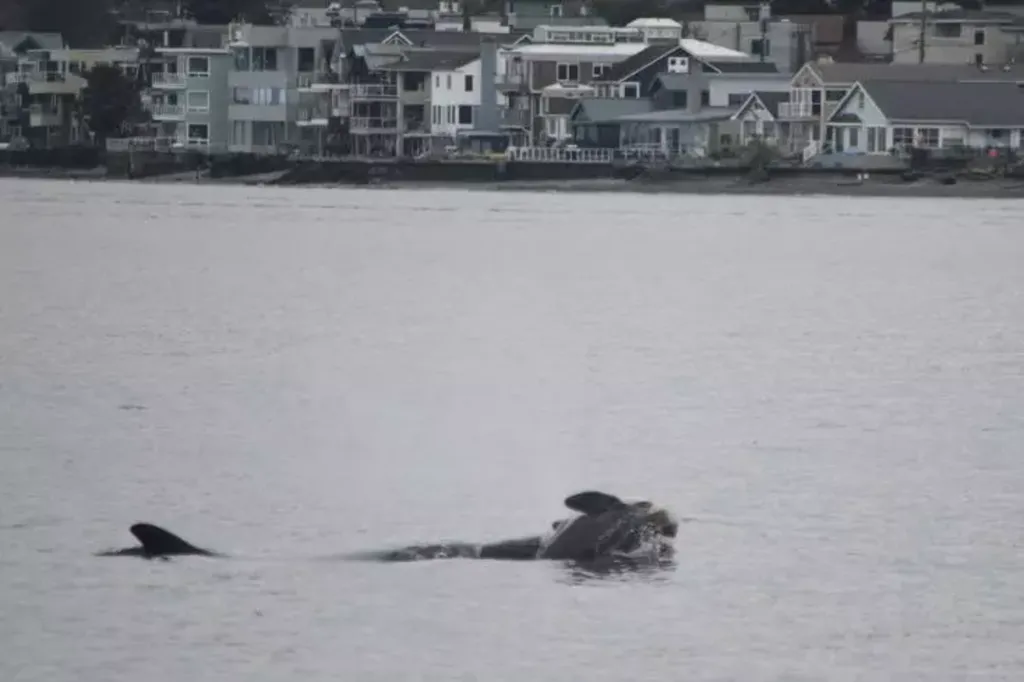 | Image fournie par le Service des pêches de la NOAA, montrant l'orque Tahlequah portant un baleineau nouveau-né récemment décédé dans le Puget Sound, au large de West Seattle, dans l'État de Washington, le 1er janvier 2025. Cette orque, qui avait porté son baleineau mort pendant plus de deux semaines en 2018, a de nouveau perdu un nouveau-né. |