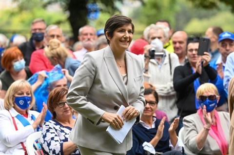 | Klara Dobrev, candidate du "Parti de la coalition démocratique", lors de la séance de clôture de la campagne, le 17 septembre 2021 à Budapest. |