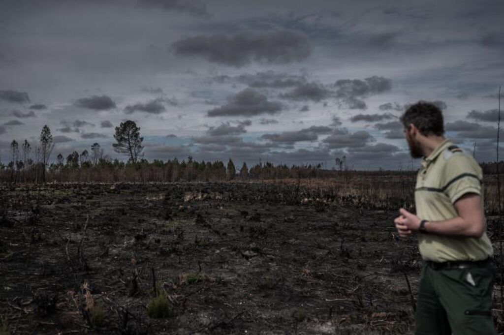 | Un membre de l'Office national des forêts (ONF) examine la végétation brûlée dans une zone qui a été ravagée par un incendie de forêt au cours de l'été 2022, près d'Hostens, dans le sud-ouest de la France, le 21 mars. |
