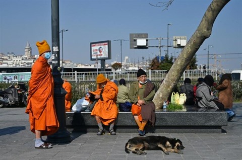 | Des touristes portent des masques de protection contre le coronavirus, le 20 mars à Istanbul. |