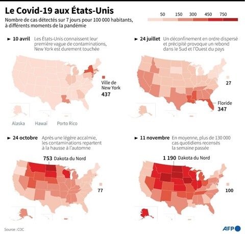 Le nombre de malades du COVID-19 hospitalisés est à son plus haut aux États-Unis depuis le début de la pandémie, à plus de 65.000 selon le COVID Tracking Project. Et le virus a fait au moins 242.621 morts dans le pays, selon un décompte de l'université Johns Hopkins. De nouvelles restrictions commencent à être décrétées au niveau local, en l'absence de consignes du gouvernement fédéral de Donald Trump.
