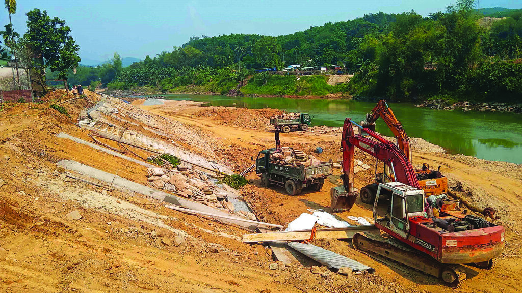 | Travaux de consolidation des berges de la rivière Truong, à Quang Nam (Centre). |